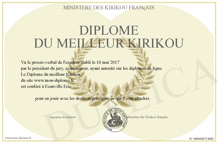 Envoyez par email votre Diplôme du meilleur Kirikou personalisé