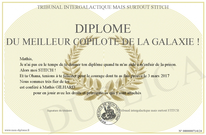 Envoyez par email votre Diplôme du Meilleur copilote de la galaxie ! personalisé