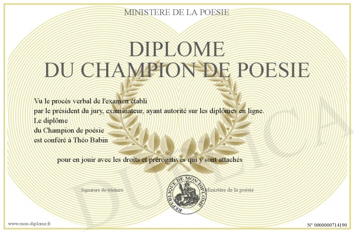 Envoyez par email votre Diplôme du champion de poésie personalisé