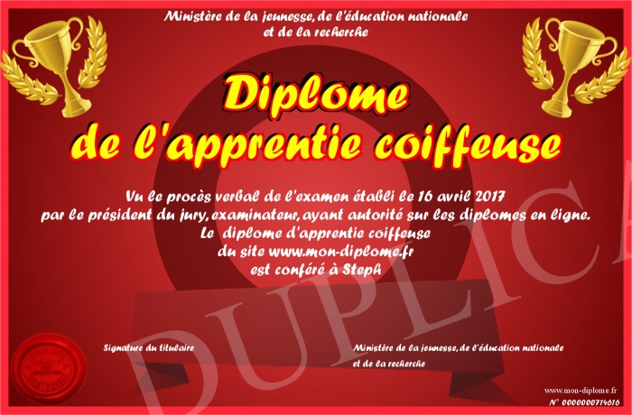 Envoyez par email votre Diplôme de l'apprentie coiffeuse personalisé