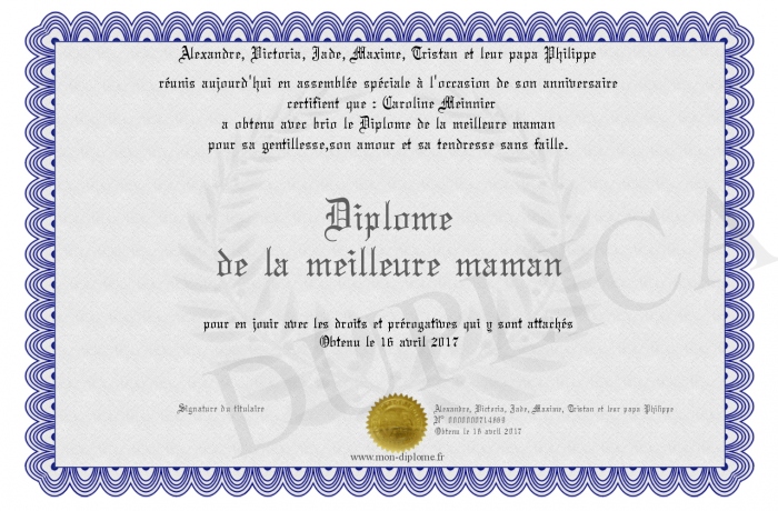 Envoyez par email votre Diplôme de la meilleure maman personalisé