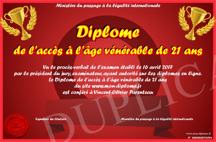 Envoyez par email votre Diplôme de l'accès à l'âge vénérable de 21 ans personalisé