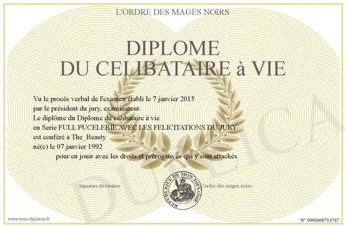 Envoyez par email votre Diplôme du célibataire à vie personalisé