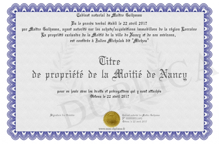 Envoyez par email votre Titre de propriété de la Moitié de Nancy personalisé