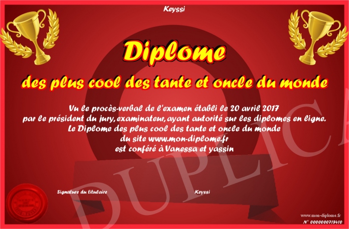 Envoyez par email votre Diplôme des plus cool des tante et oncle du monde personalisé