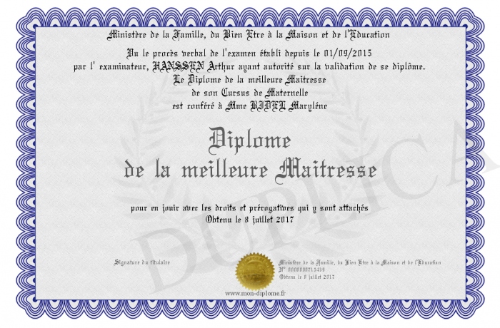 Envoyez par email votre Diplome de la meilleure Maitresse personalisé