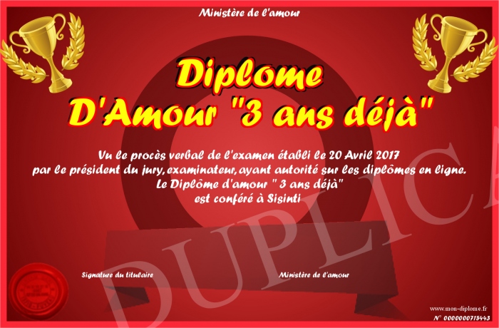 Envoyez par email votre Diplôme D'Amour -3 ans déjà- personalisé