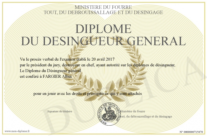 Envoyez par email votre Diplôme du Désingueur général personalisé