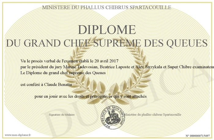 Envoyez par email votre Diplôme du grand chef supreme des Queues personalisé