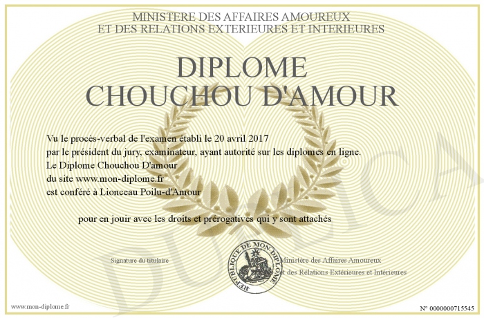 Envoyez par email votre Diplôme Chouchou D'amour personalisé