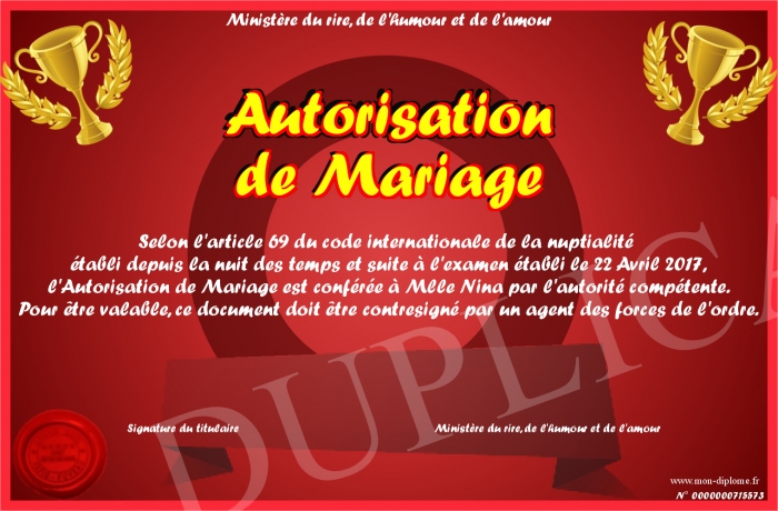 Envoyez par email votre Autorisation de Mariage personalisé