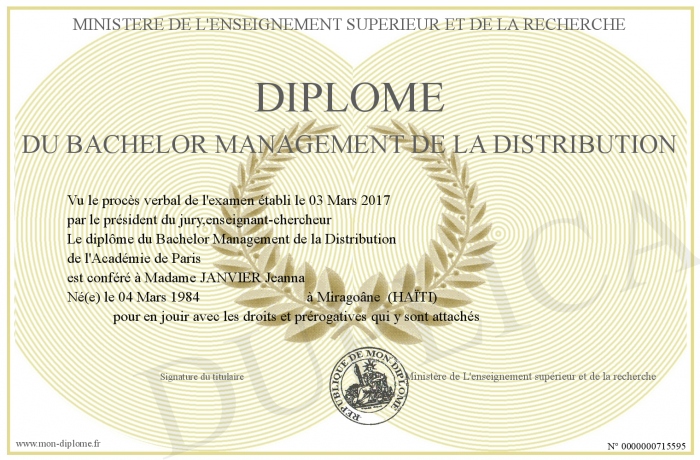 Envoyez par email votre Diplôme du Bachelor Management De la Distribution personalisé