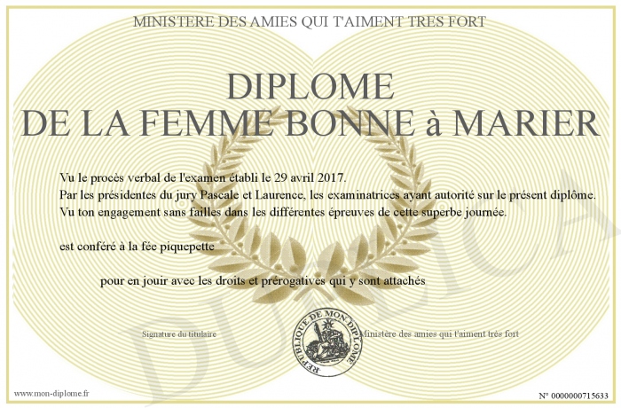 Envoyez par email votre Diplôme de la femme bonne à marier personalisé