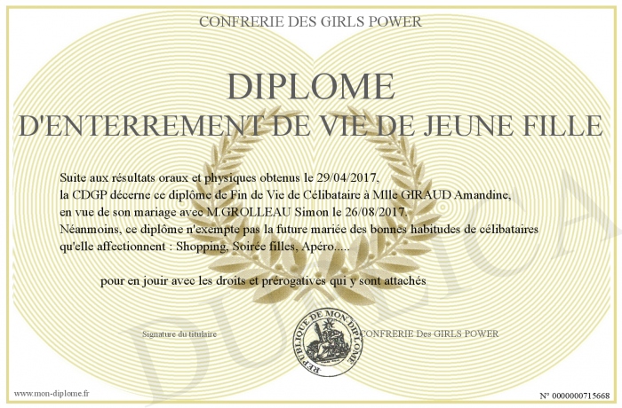 Envoyez par email votre Diplome d'Enterrement de vie de jeune fille personalisé