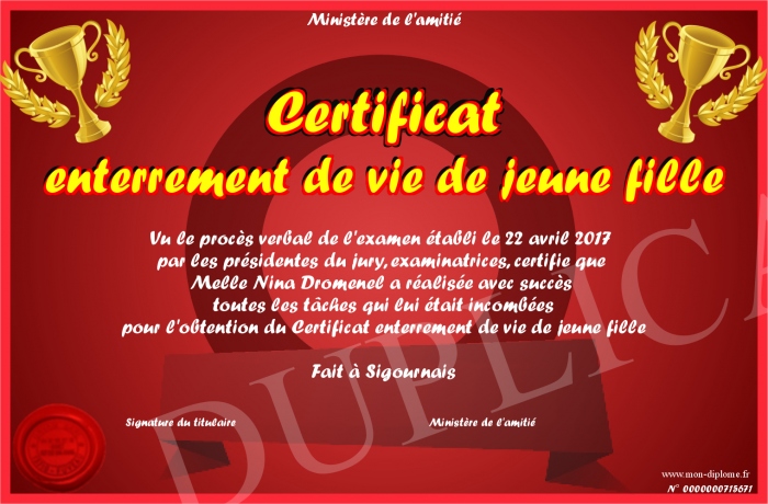 Envoyez par email votre Certificat enterrement de vie de jeune fille personalisé