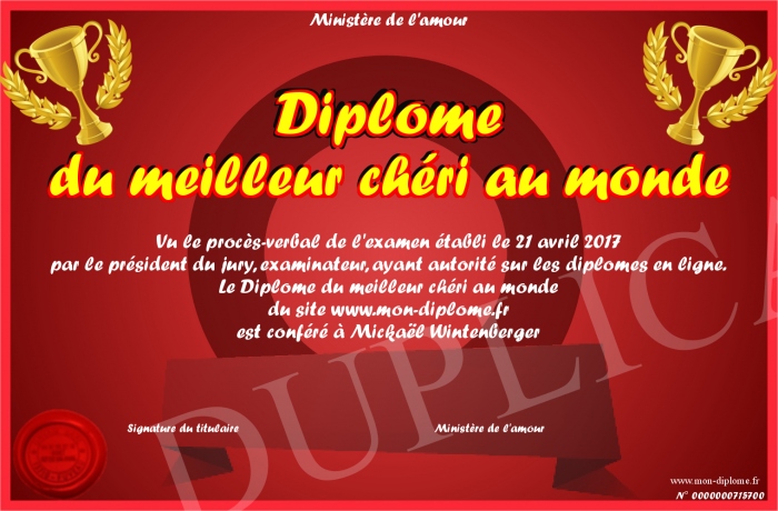 Envoyez par email votre Diplôme du meilleur chéri au monde personalisé