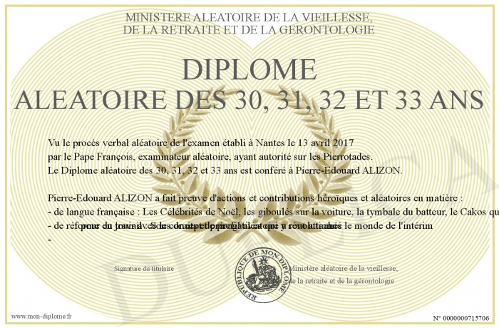 Envoyez par email votre Diplôme aléatoire des 30, 31, 32 et 33 ans personalisé