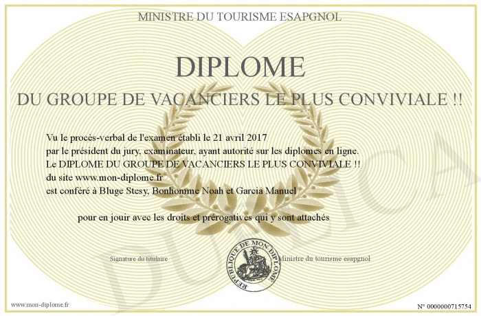 Envoyez par email votre DIPLOME DU GROUPE DE VACANCIERS LE PLUS CONVIVIALE !! personalisé