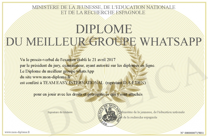 Envoyez par email votre Diplôme du meilleur groupe whatsApp personalisé