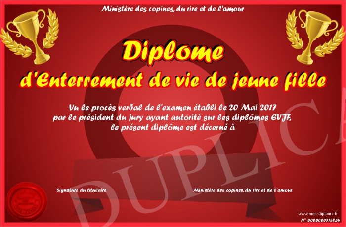 Envoyez par email votre Diplome d'Enterrement de vie de jeune fille personalisé