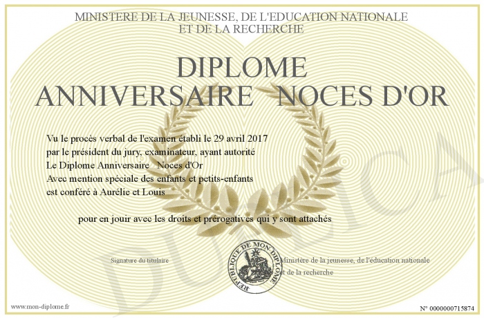Envoyez par email votre Diplôme Anniversaire Noces d'Or personalisé