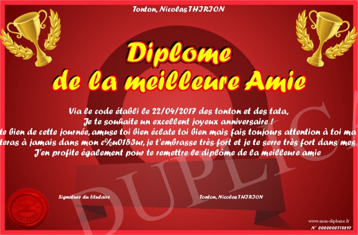 Envoyez par email votre Diplome de la meilleure Amie personalisé