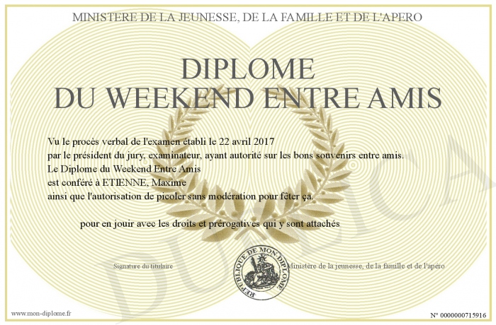 Envoyez par email votre Diplôme du Weekend Entre Amis personalisé