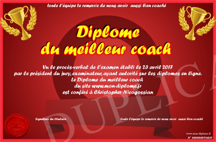 Envoyez par email votre Diplôme du meilleur coach personalisé