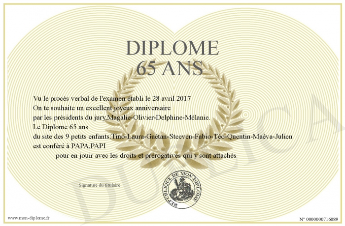 Envoyez par email votre Diplôme 65 ans personalisé