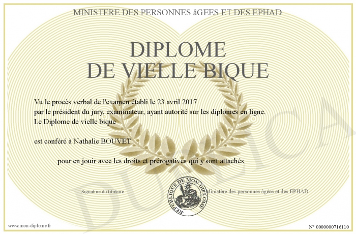 Envoyez par email votre Diplôme de vielle bique personalisé