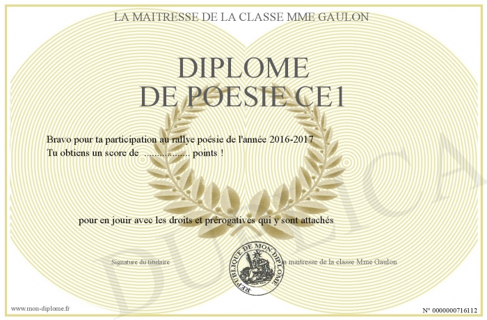 Envoyez par email votre Diplôme de poésie CE1 personalisé