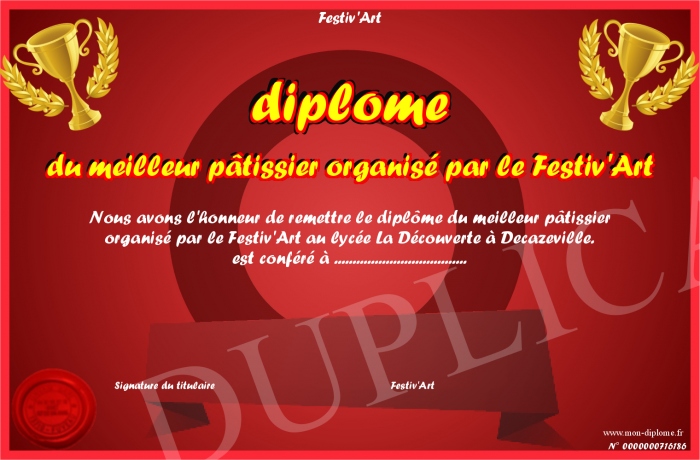 Envoyez par email votre diplôme du meilleur pâtissier organisé par le Festiv'Art personalisé