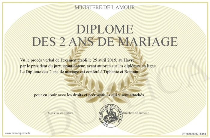 Envoyez par email votre Diplôme des 2 ans de mariage personalisé