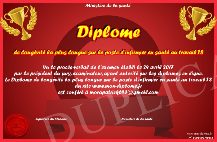 Envoyez par email votre Diplôme de longévité la plus longue sur le poste d'infirmier en santé au travail TS personalisé