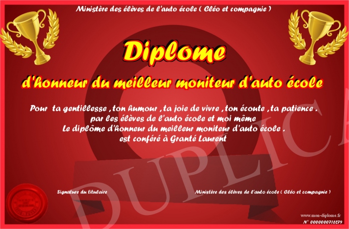 Envoyez par email votre Diplôme d'honneur du meilleur moniteur d'auto école personalisé