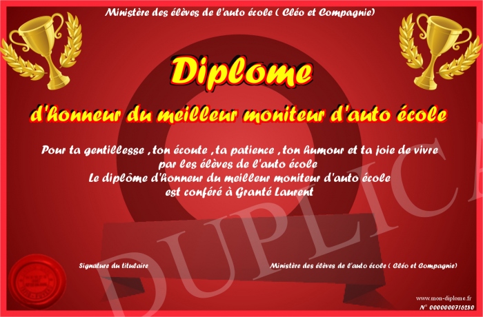 Envoyez par email votre Diplôme d'honneur du meilleur moniteur d'auto école personalisé