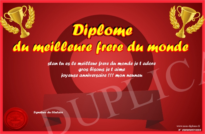 Envoyez par email votre Diplôme du meilleure frere du monde personalisé