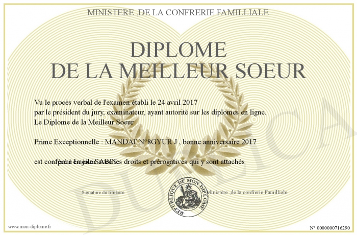 Envoyez par email votre Diplôme de la Meilleur Soeur personalisé