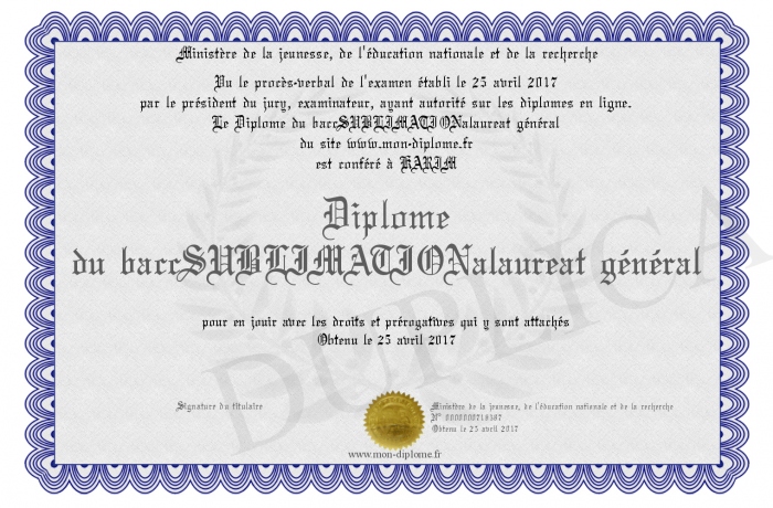 Envoyez par email votre Diplôme du baccSUBLIMATIONalaureat général personalisé