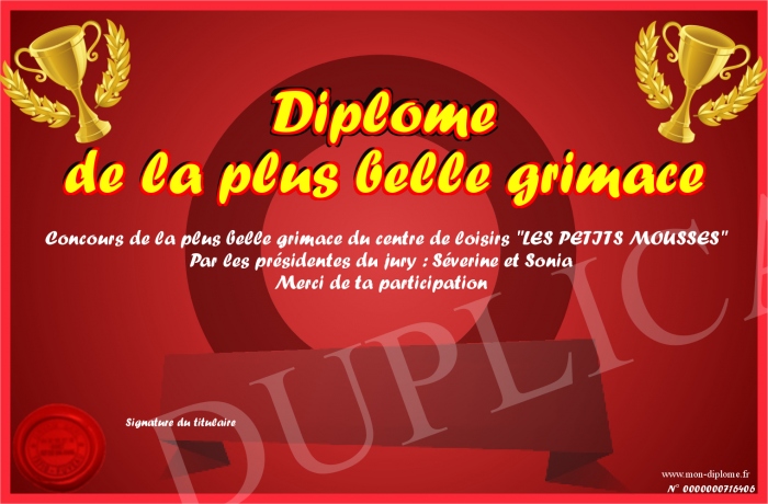 Envoyez par email votre Diplôme de la plus belle grimace personalisé