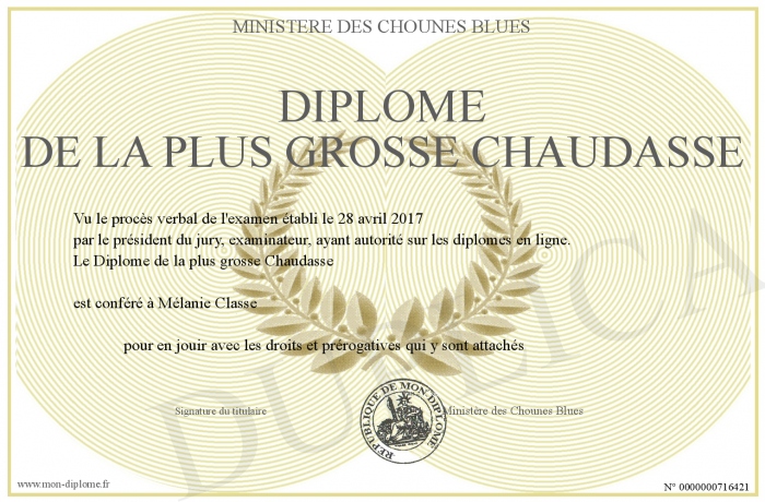 Envoyez par email votre Diplôme de la plus grosse Chaudasse personalisé