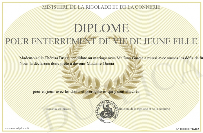 Envoyez par email votre Diplôme pour enterrement de vie de jeune fille personalisé