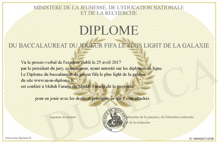 Envoyez par email votre Diplôme du baccalaureat du joueur fifa le plus light de la galaxie personalisé