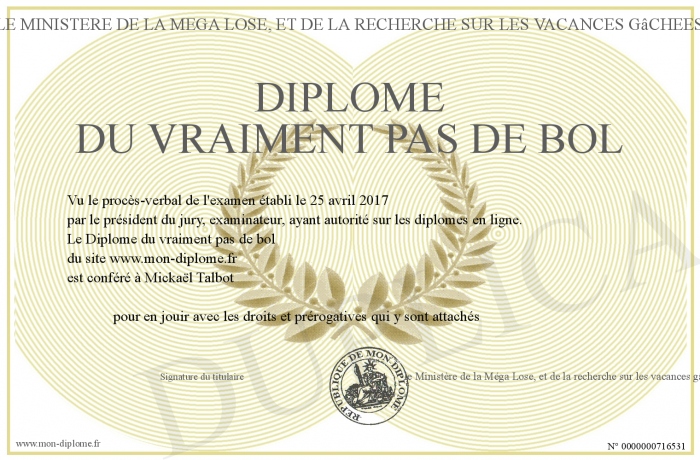 Envoyez par email votre Diplôme du vraiment pas de bol personalisé