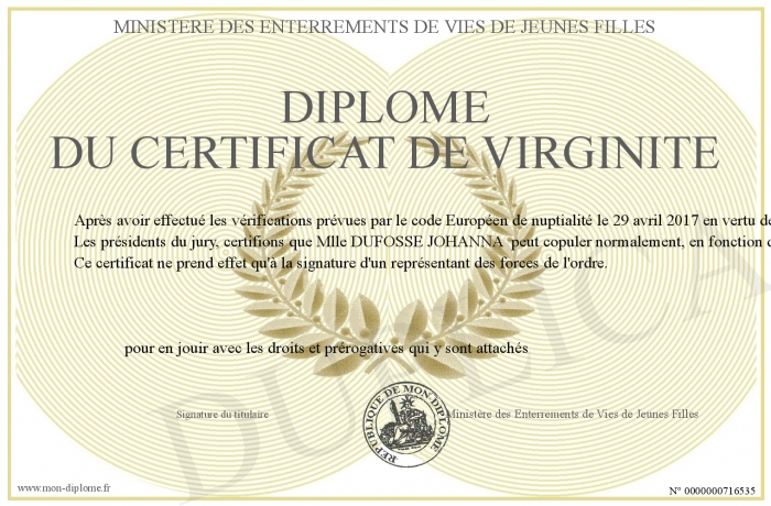 Envoyez par email votre Diplôme du Certificat de Virginité personalisé