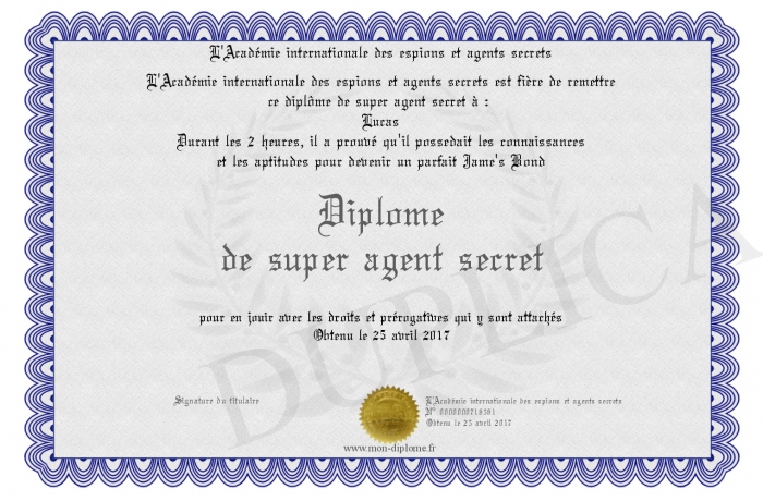 Envoyez par email votre Diplôme de super agent secret personalisé