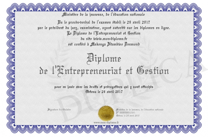 Envoyez par email votre Diplôme de l'Entrepreneuriat et Gestion personalisé