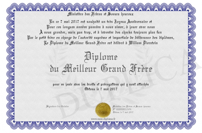 Envoyez par email votre Diplôme du Meilleur Grand Frère personalisé