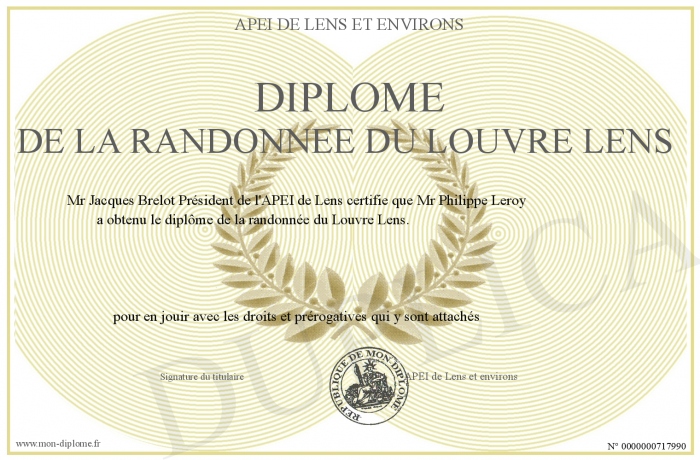 Envoyez par email votre Diplôme de la randonnée du Louvre Lens personalisé