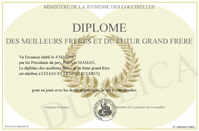 Envoyez par email votre DIPLOME DES MEILLEURS FRERES ET DU FUTUR GRAND FRERE personalisé